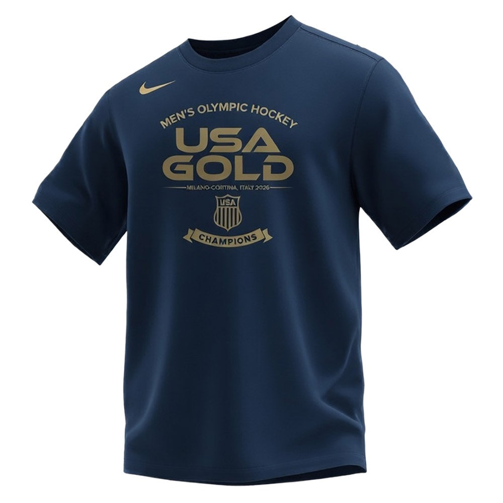 Celebrate the US Men's Hockey team as the 2026 Gold Medal Winners! This Nike core 100% cotton short sleeve shirt is the perfect way to memorialize this special Olympic success. The chest logo features stylized team and event graphics to declare your support!