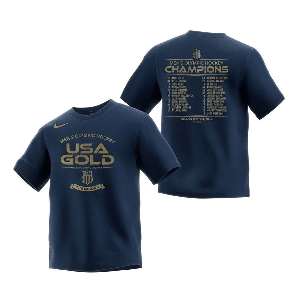 Celebrate the US Men's Hockey team as the 2026 Gold Medal Winners! This Nike core 100% cotton short sleeve shirt is the perfect way to memorialize this special Olympic success. The chest logo features stylized team and event graphics to declare your support! Back graphics feature the team roster to remember every contribution.