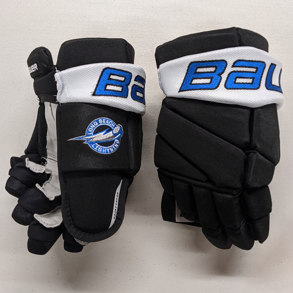 - Custom Bauer Vapor Elite hockey gloves in Long Beach Lightning color pattern. Embroidered Long Beach Lightning logo on thumb.