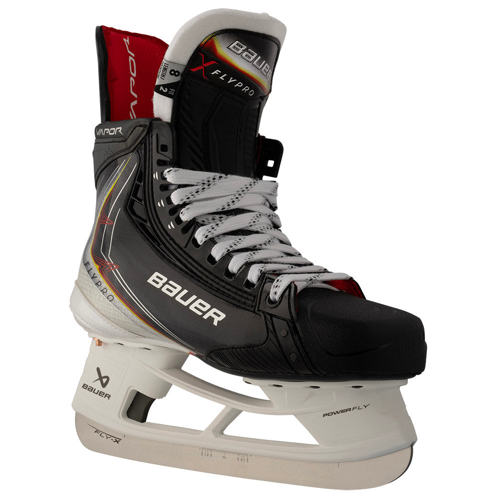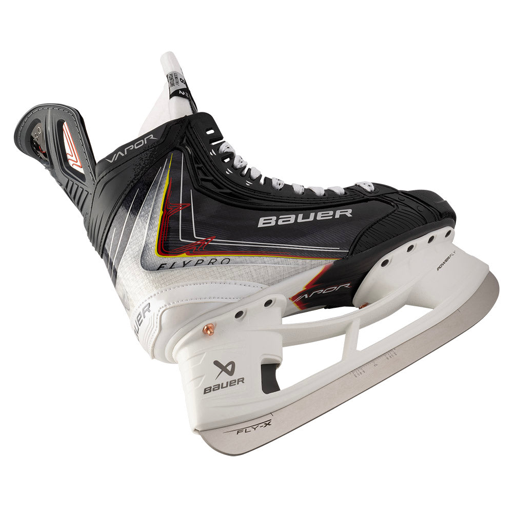 The FLYPRO ice hockey skate is the second model in the 2025 Bauer Vapor lineup and delivers high-level speed and acceleration for the elite level player. Building on the performance of the previous generation X5 Pro skate, the new FLYPRO model features a CURV® composite boot with integrated flex facing which has greater ability to store energy in the skate and flex with the player allowing for more energy to be loaded in the stride.